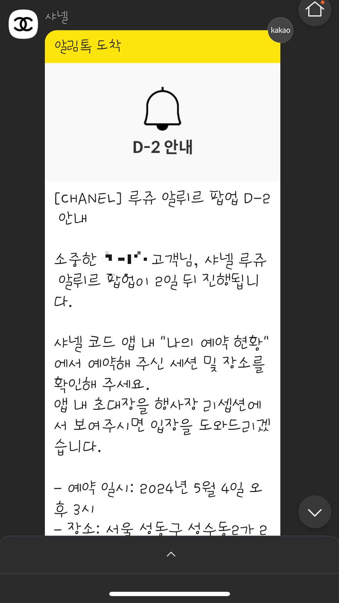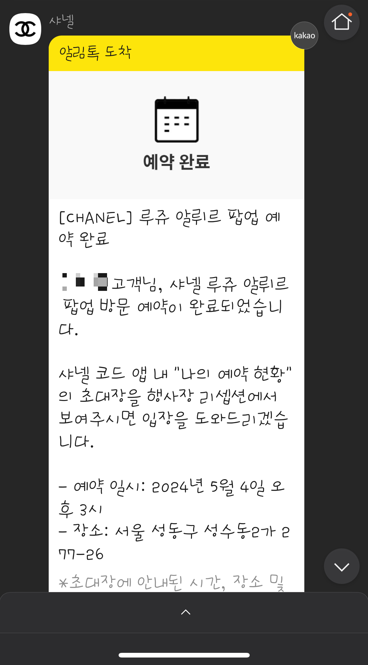 예약하면 카톡으로 예약확인 문자가 오고
