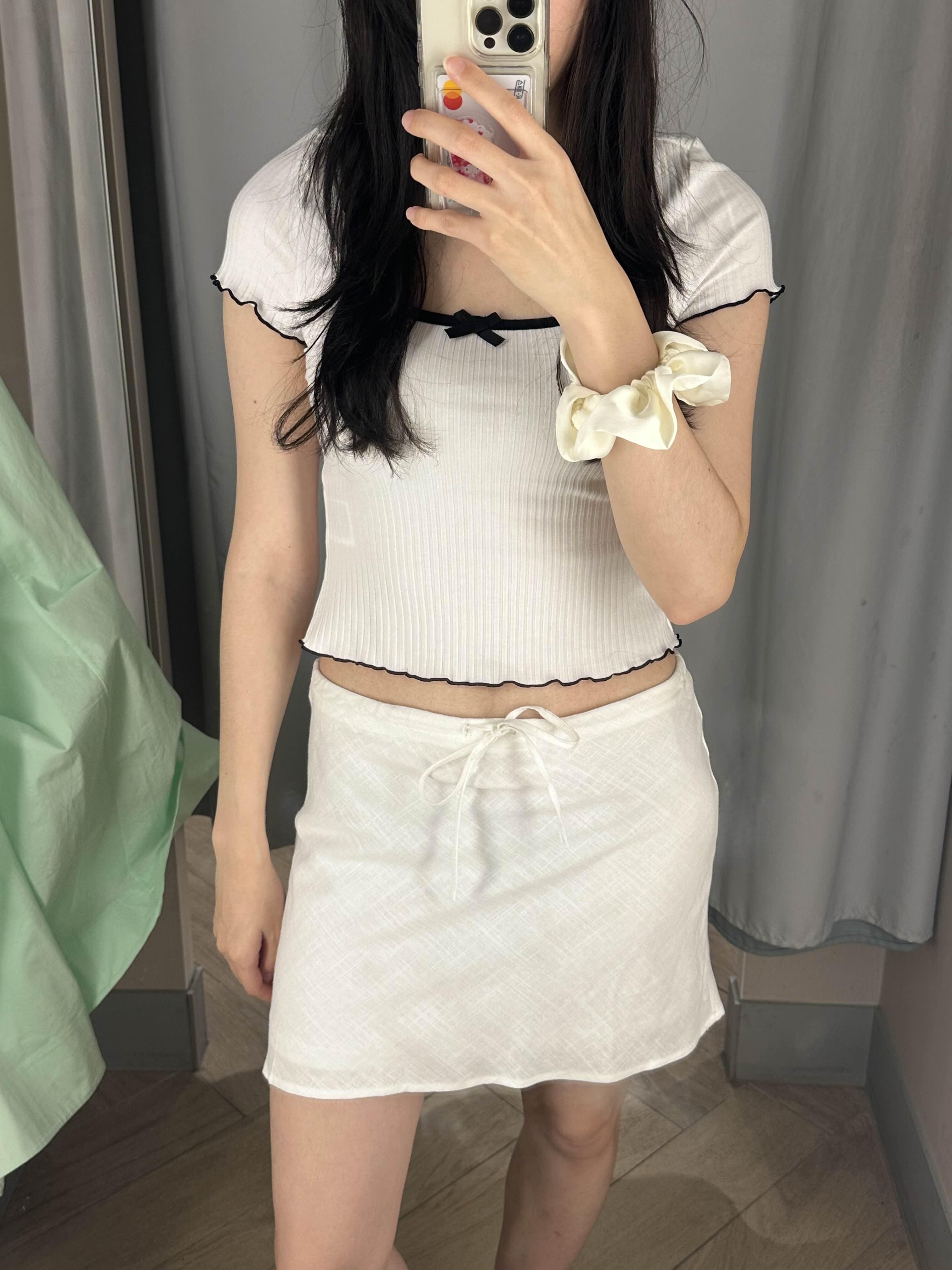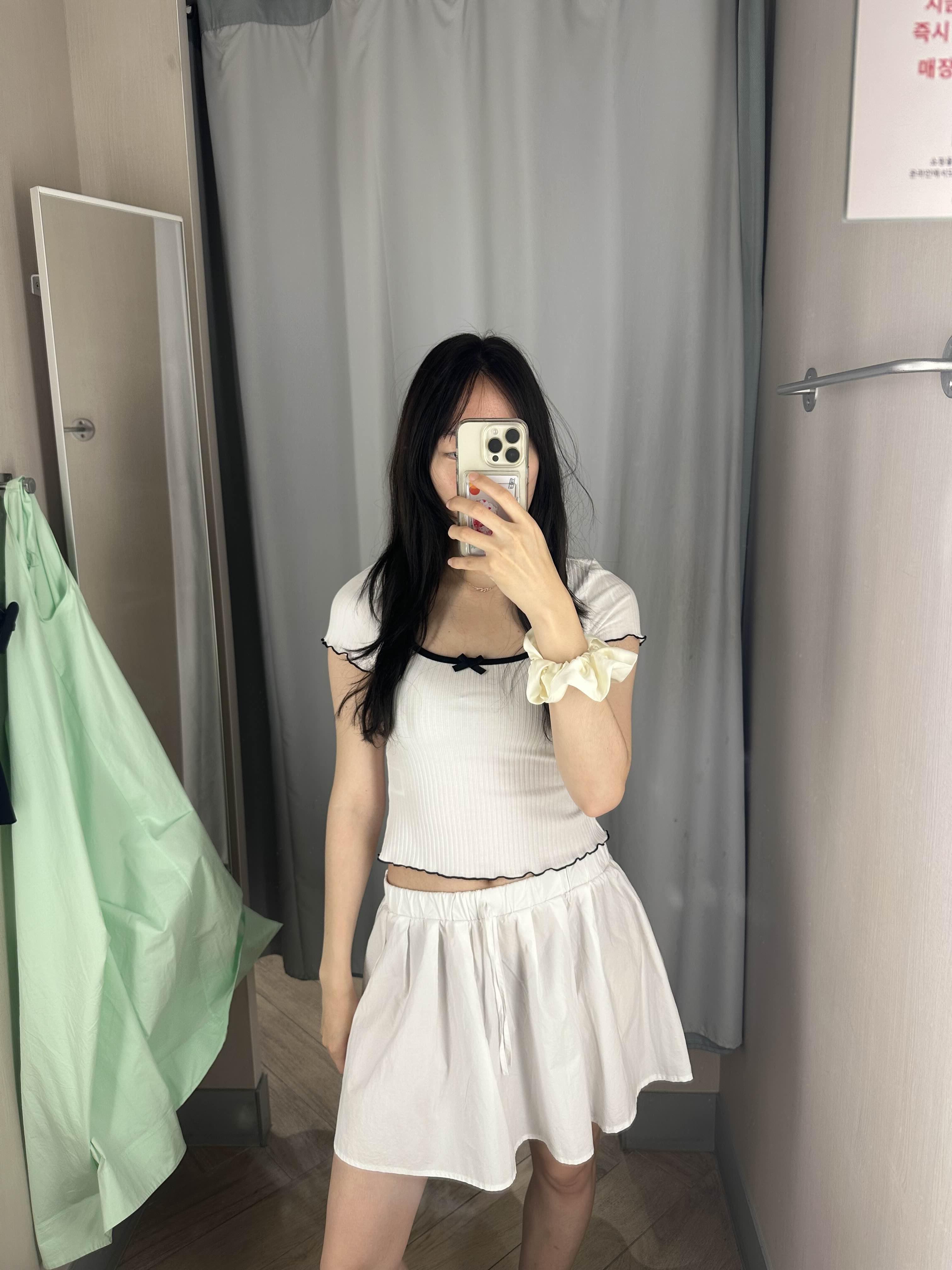 위에 리본이 달려 있는 흰색 티셔츠 너무 예쁘지 않나요?