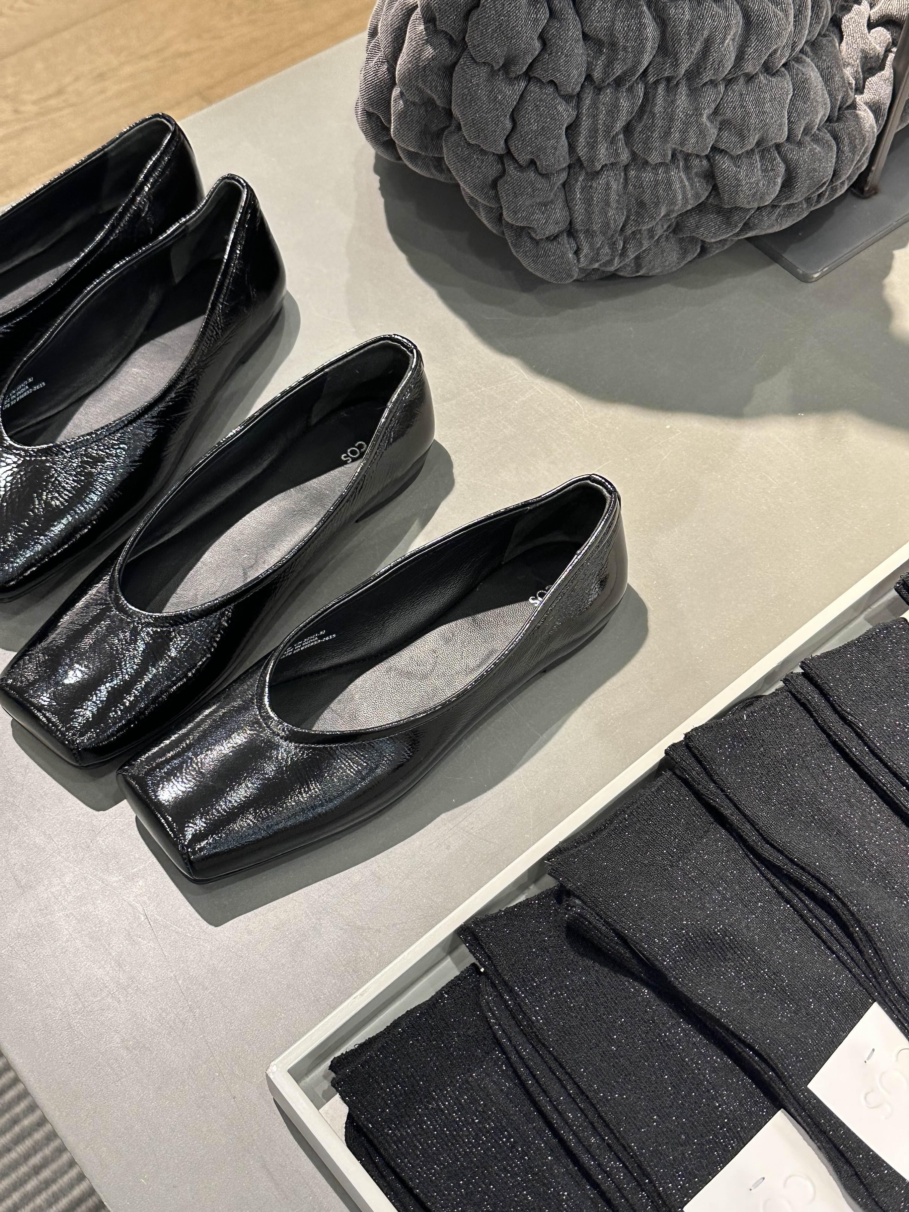 네모난 앞코와 광택감 있는 플랫 슈즈