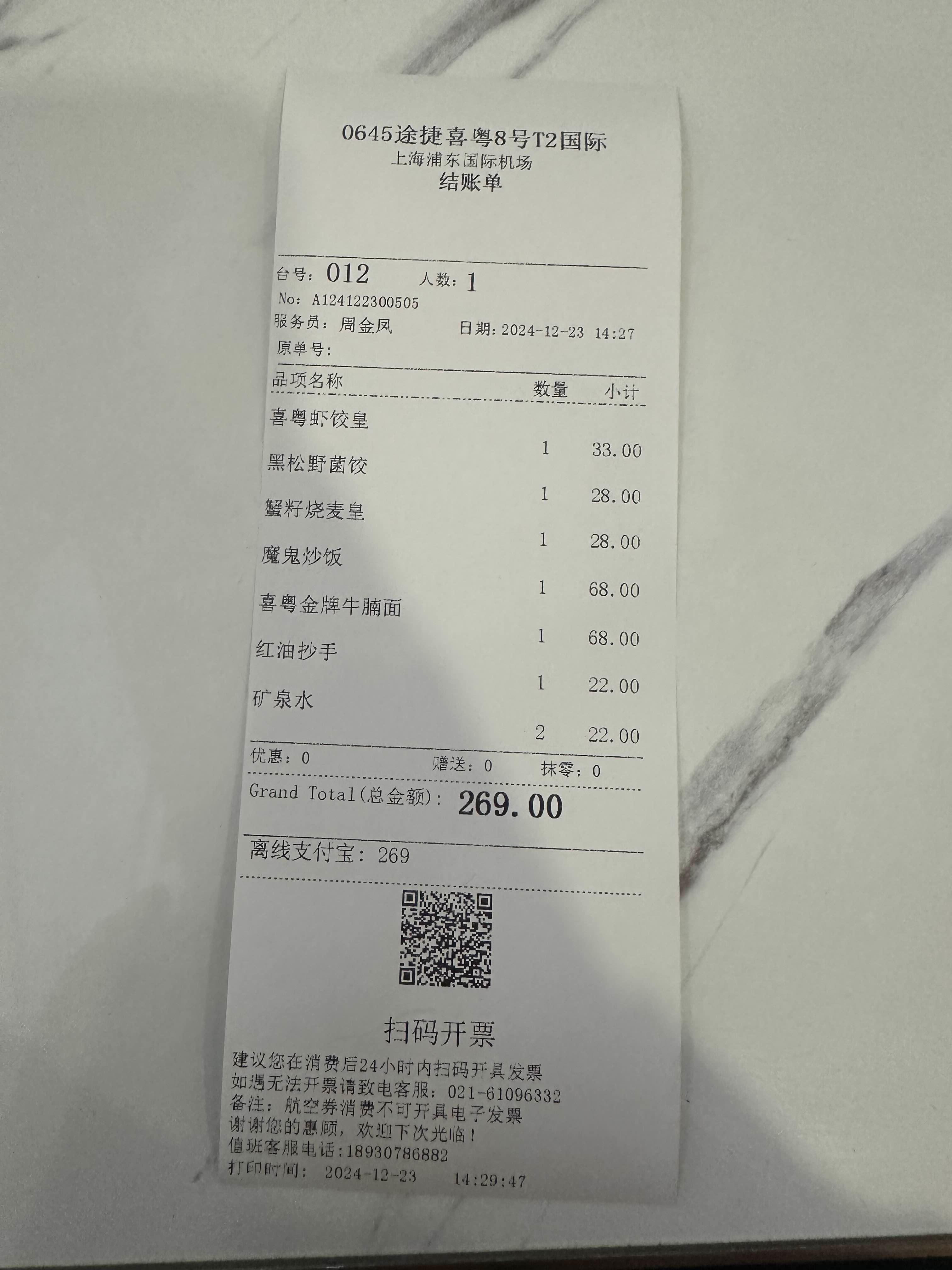 총 269위안입니다.