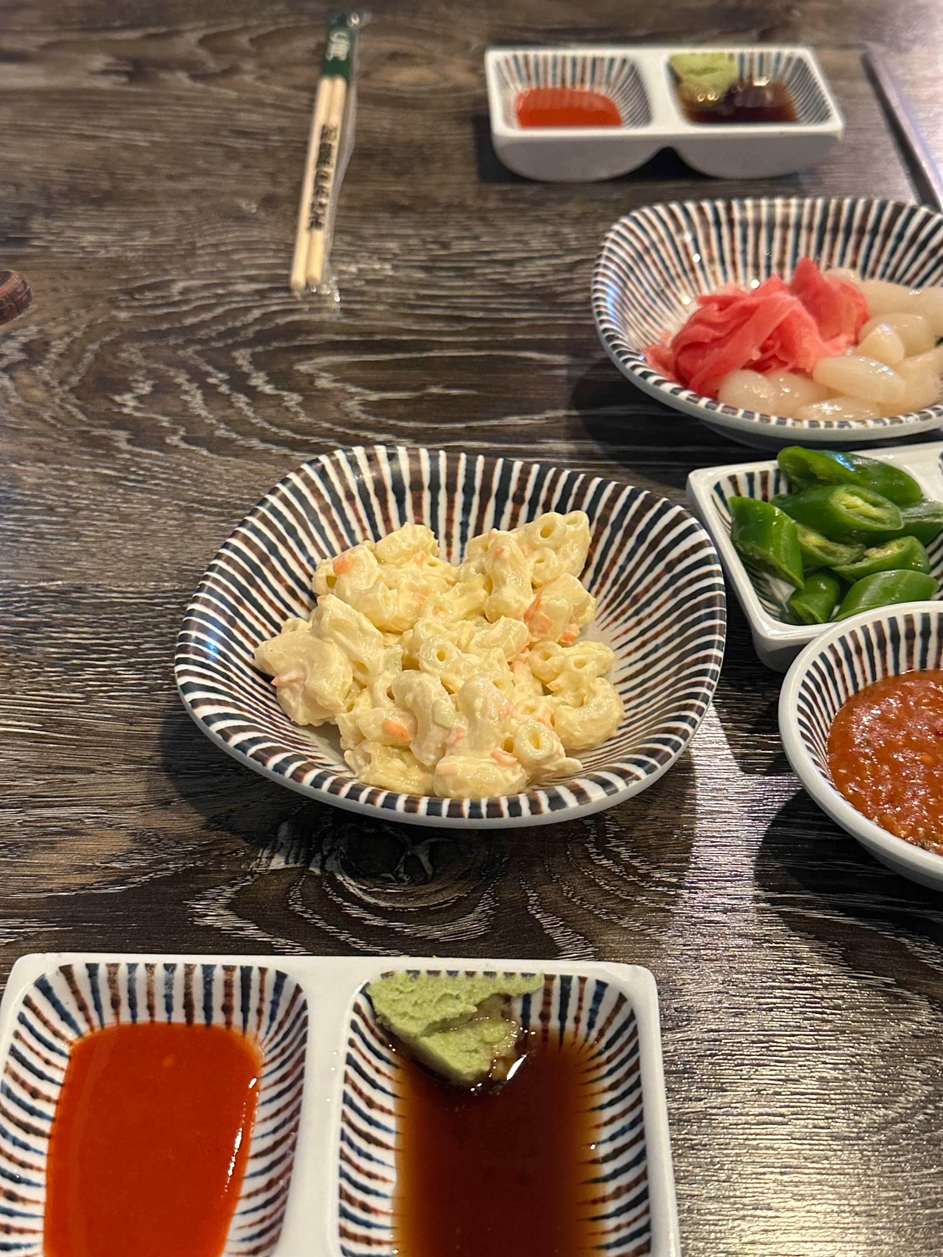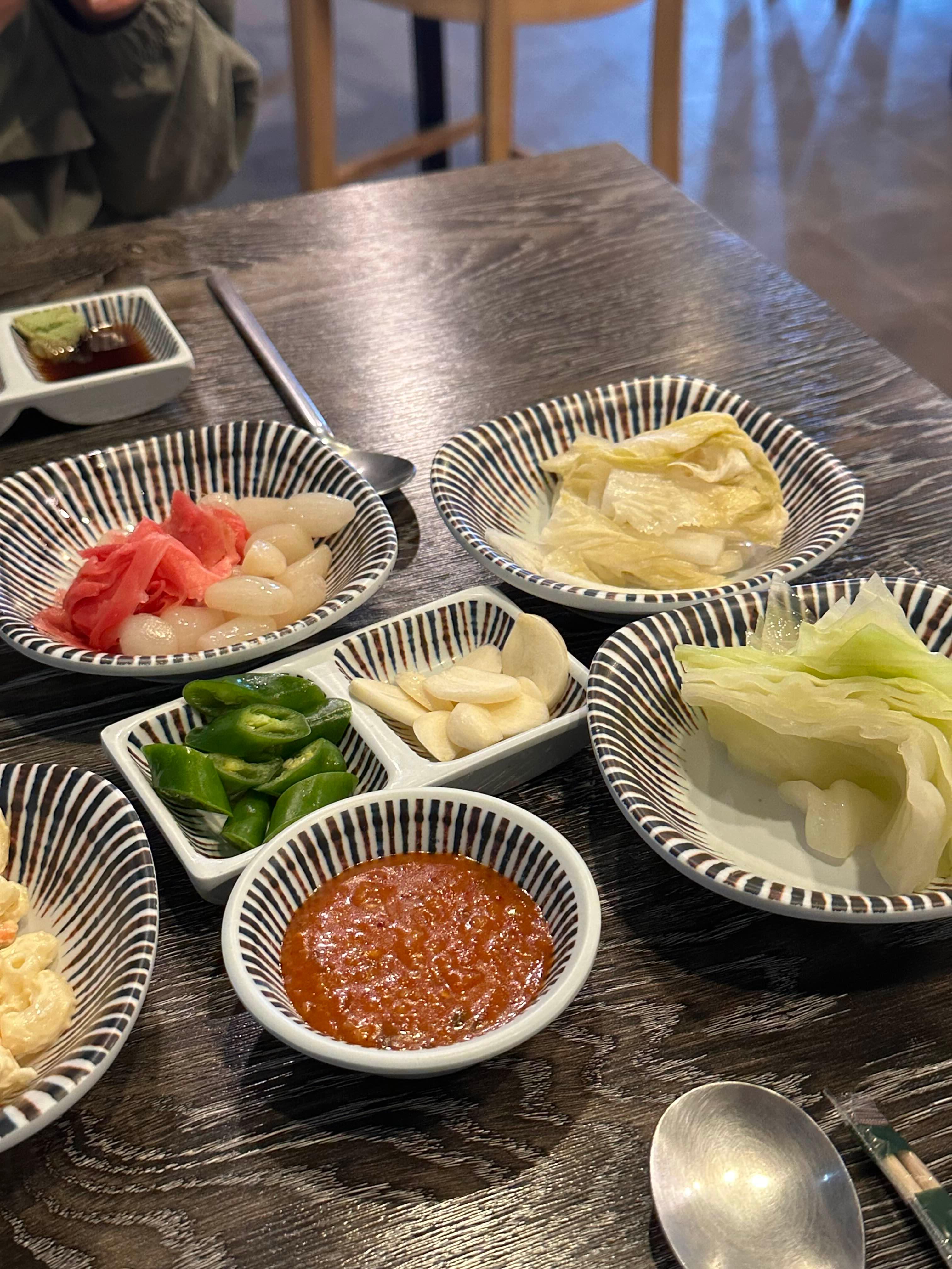양배추찐것, 백김치, 쌈장, 고추, 마늘, 생강절임, 마카로니 등