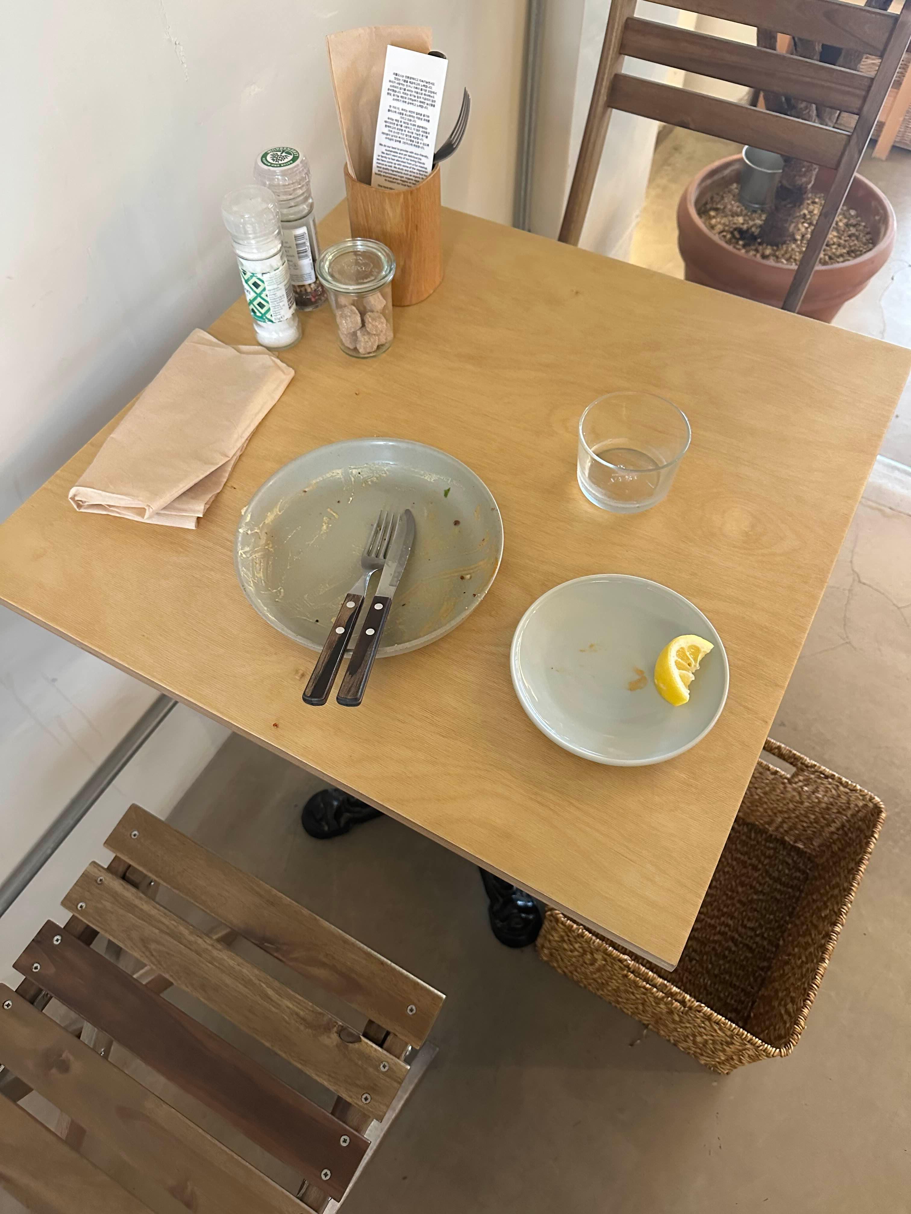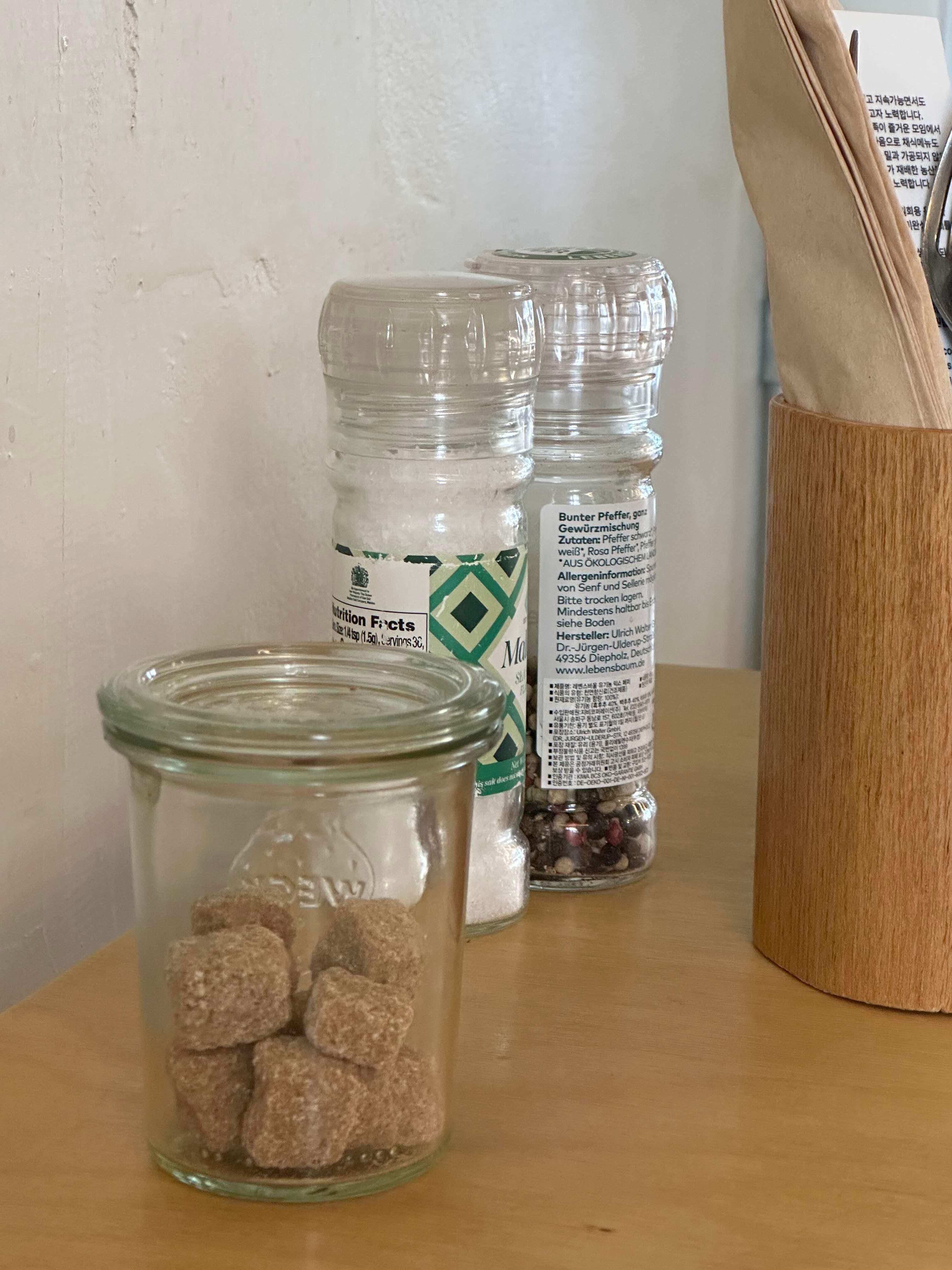 테이블에는 설탕 소금 후추가 비치되어 있습니다.