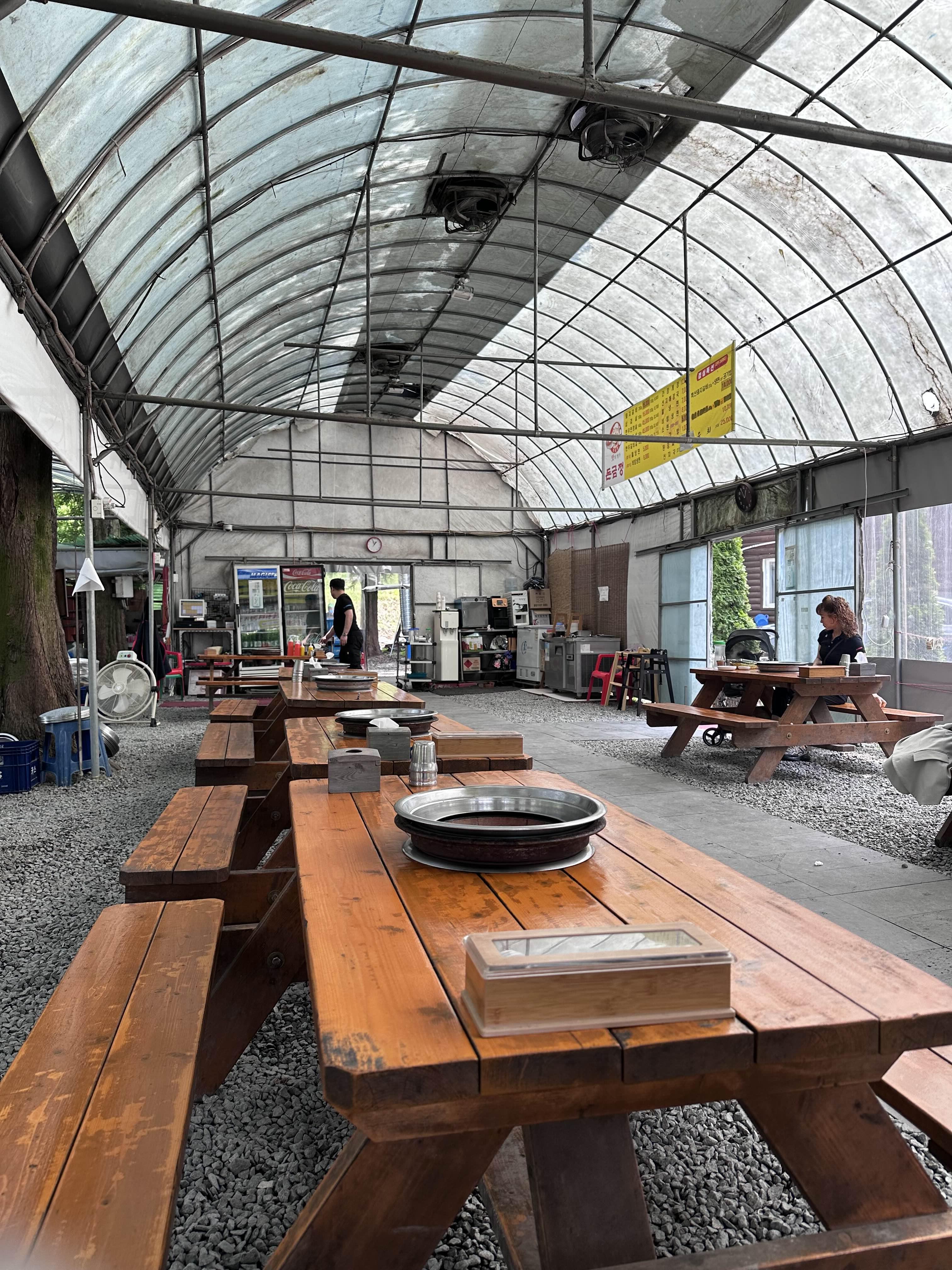 돈금정에는 야외에 앉아서 먹을 수 있는 테라스 좌석이 있습니다. 비닐하우스존!
