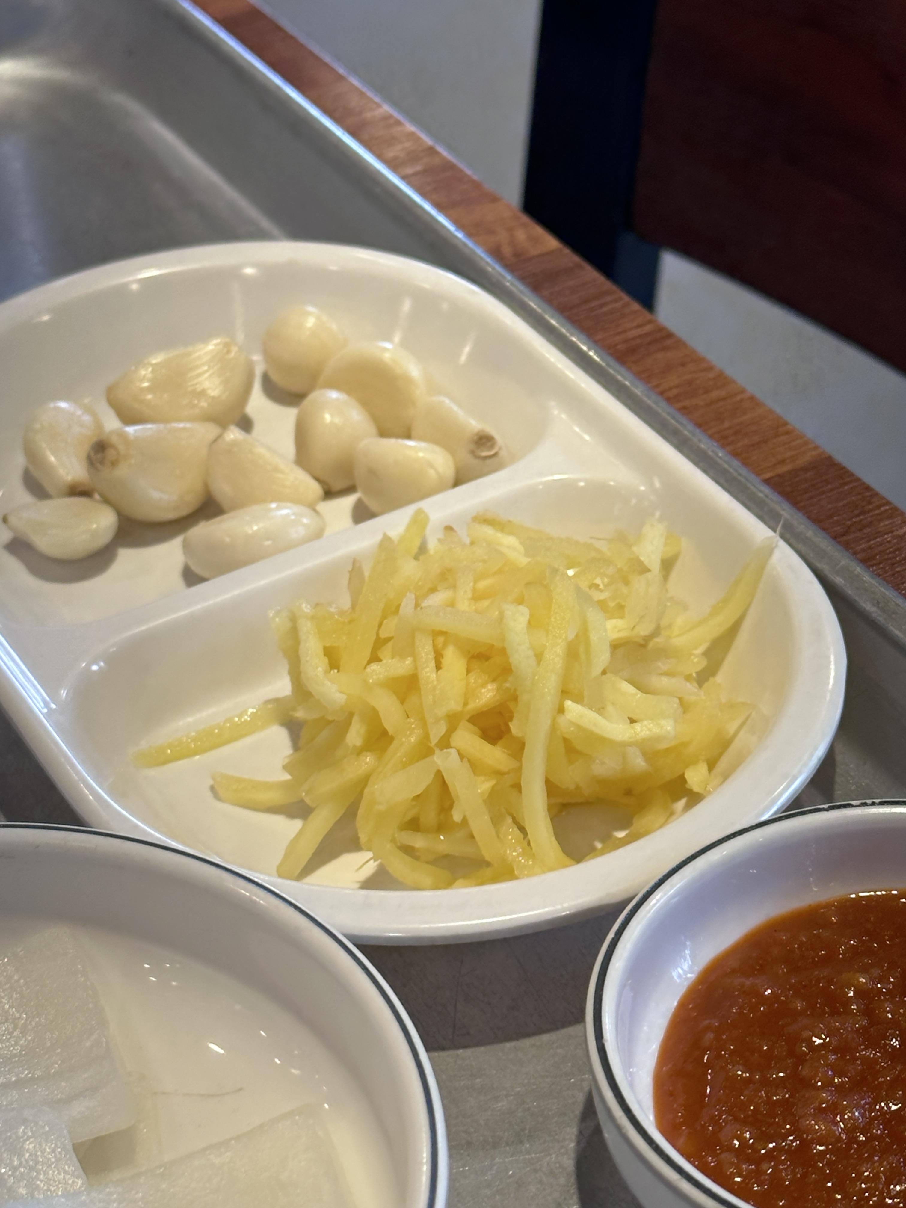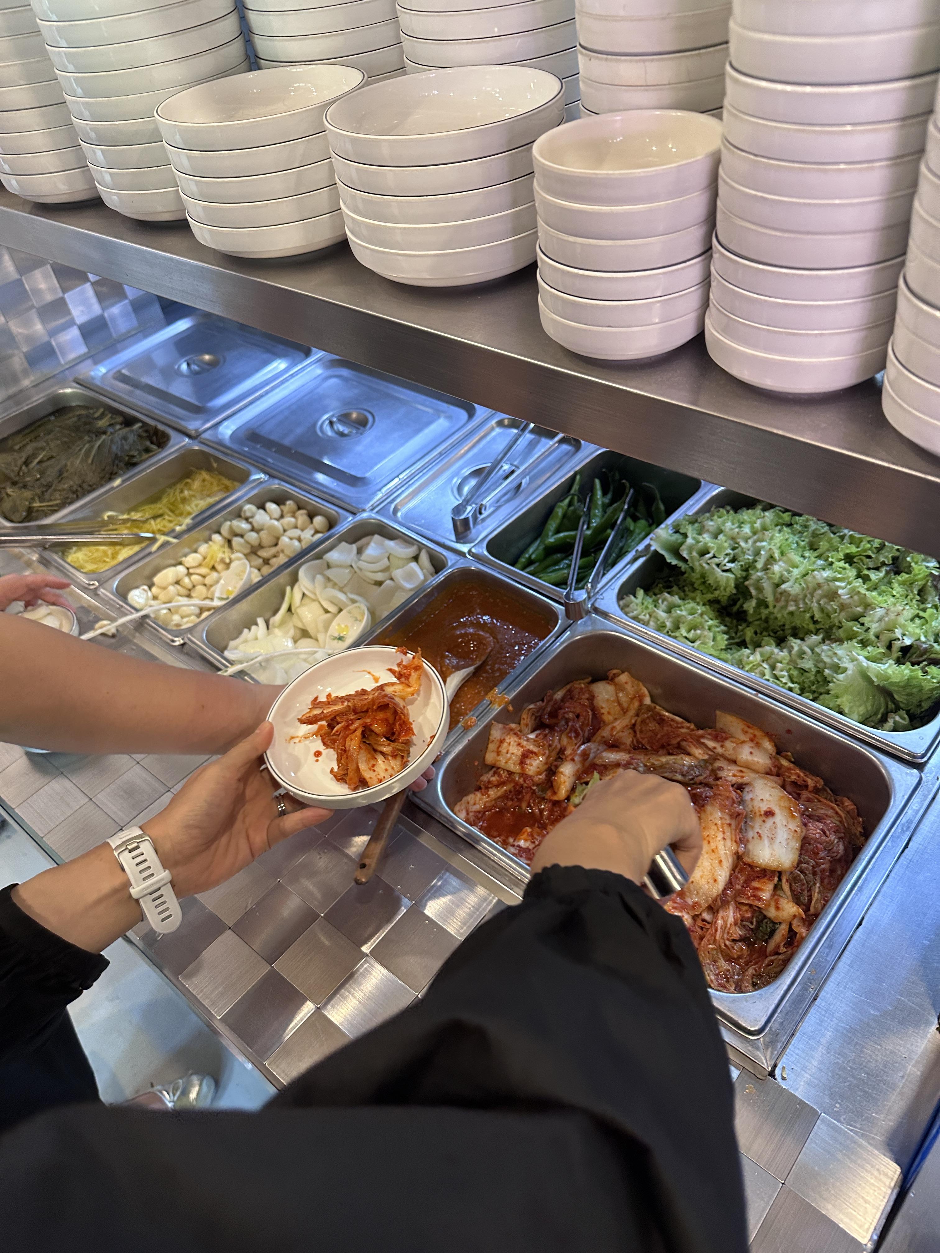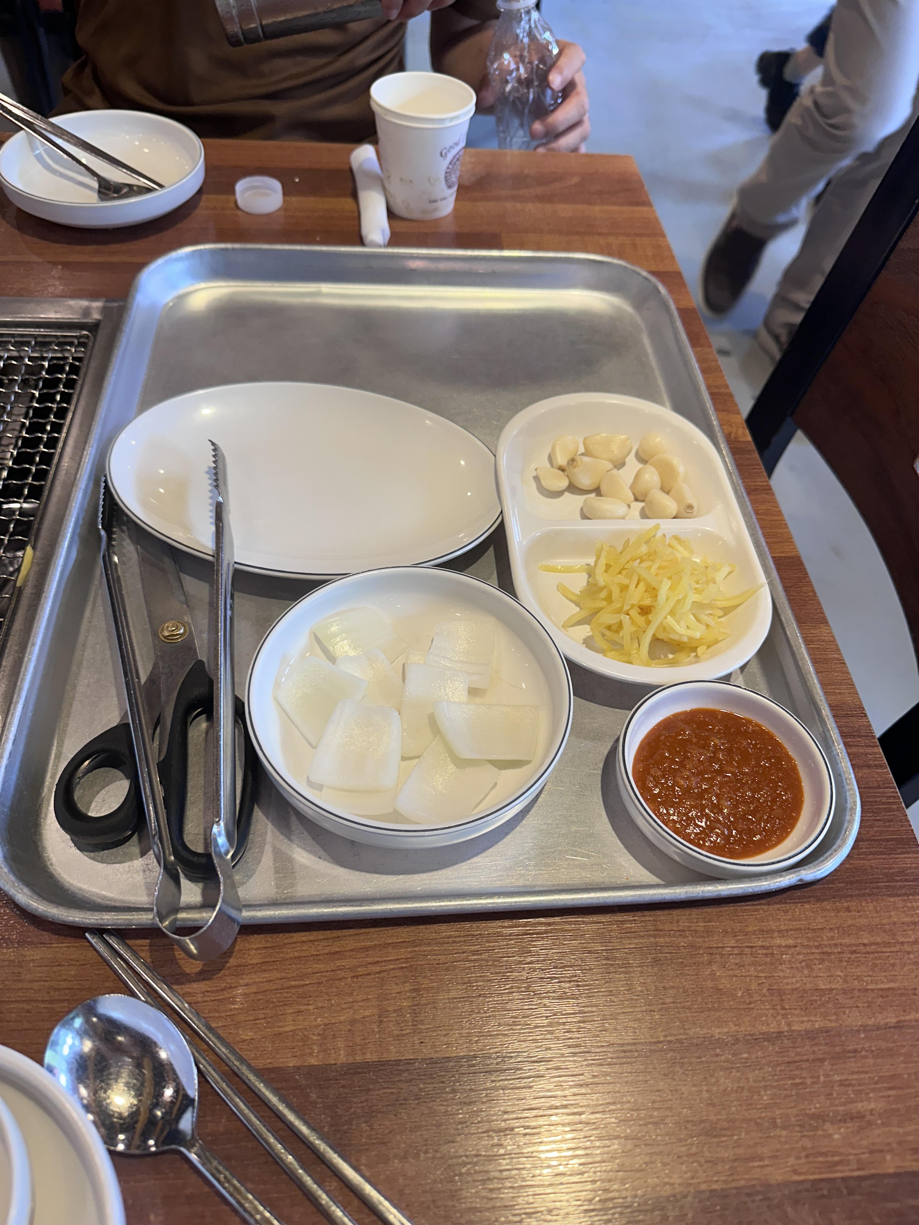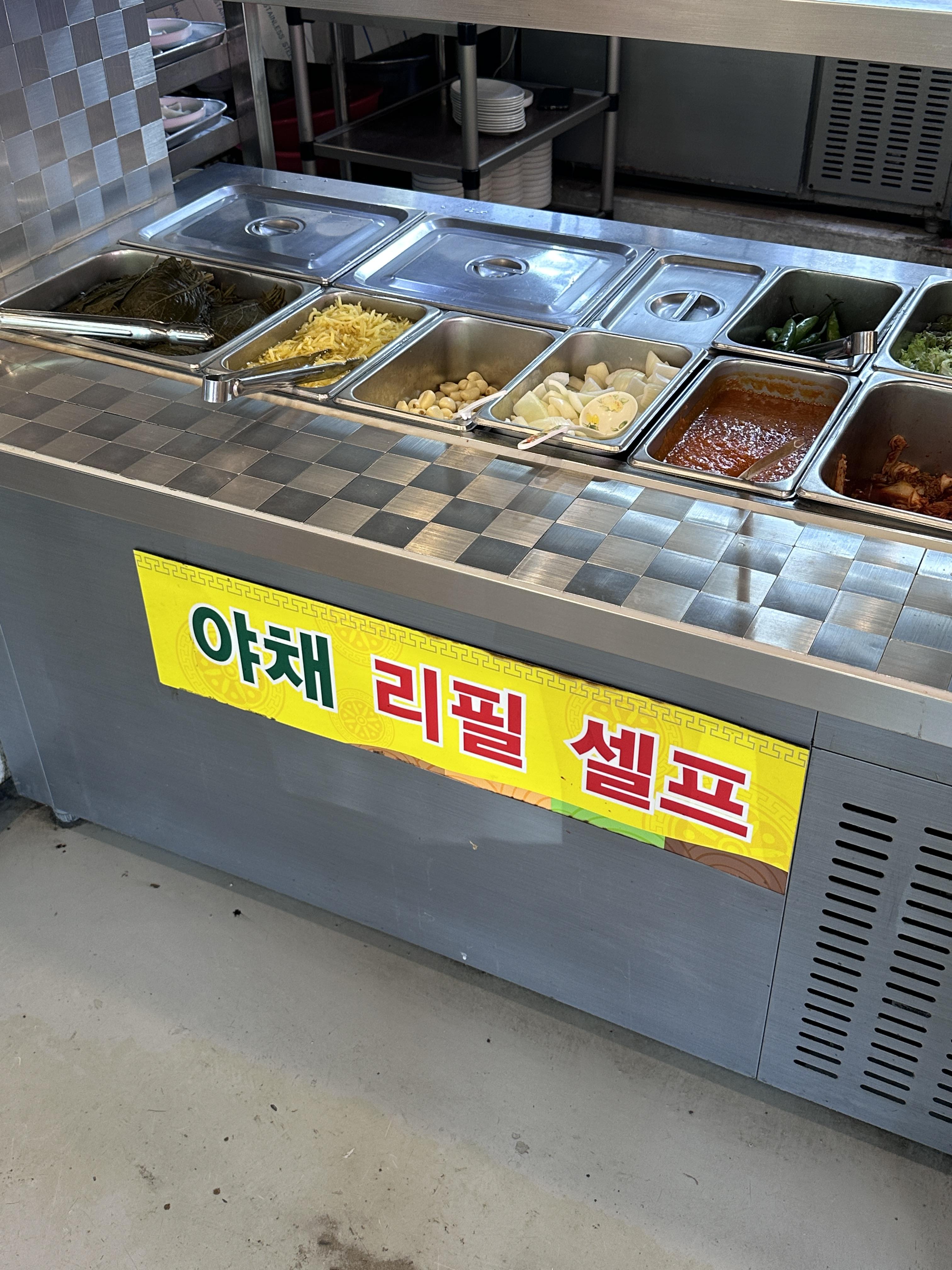 마늘, 양파, 쌈장, 깻잎절임, 김치, 상추, 고추 등 야채들을 셀프로 계속 먹을 수 있습니다.