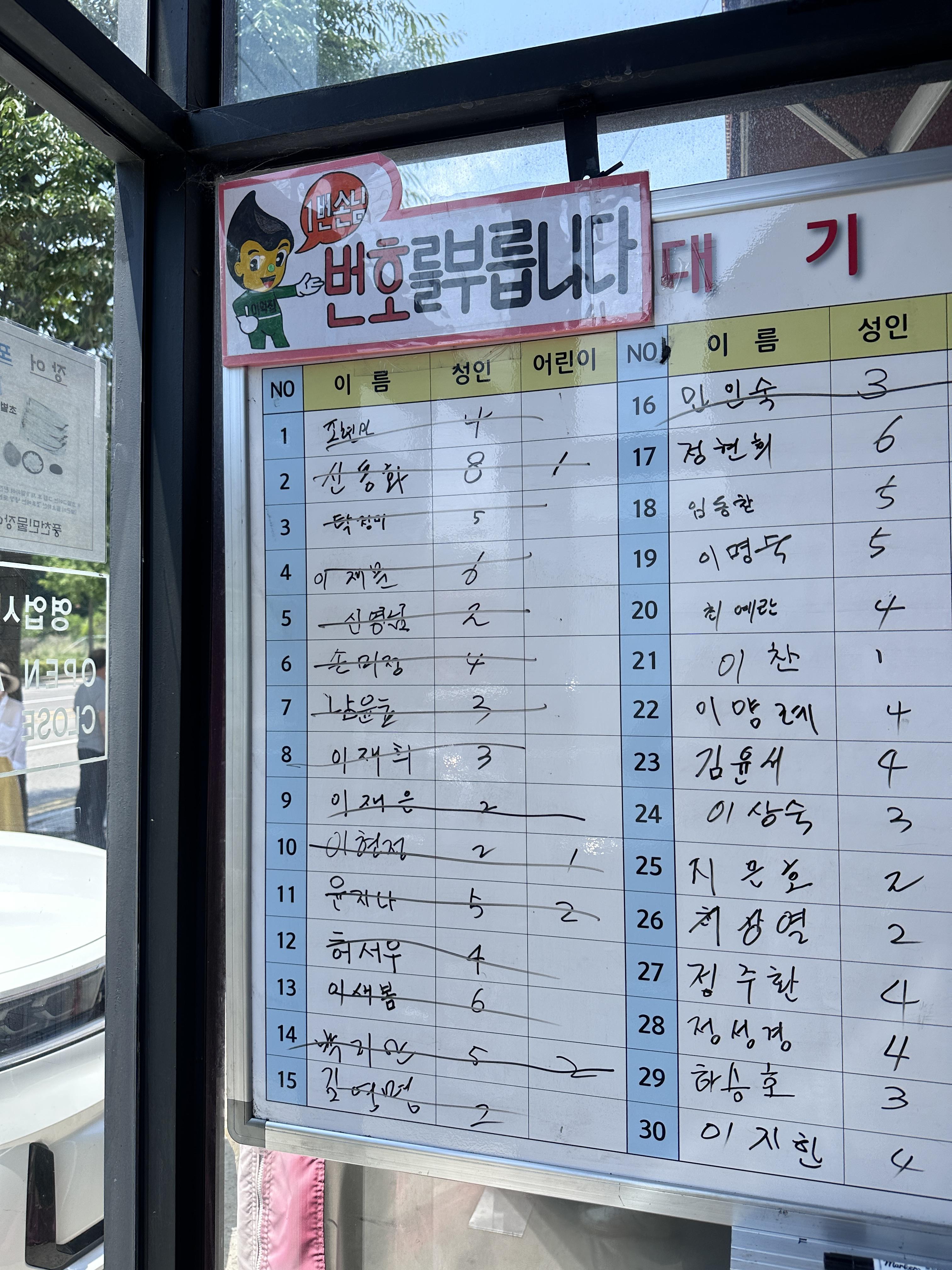흰색 보드에다가 이름이랑 인원수 적으면 한 명씩 마이크로 호명하고 들어갑니다.